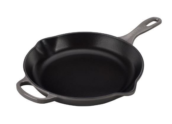This iron handle provides a solid grip that makes it easy to carry the beautiful piece of cookware straight from the stovetop to a table trivet. Enamel coating on the inside of the skillet develops a natural patina which can enhance the pan’s ability to sear and fry foods. Le Creuset’s Oyster Grey Cast Iron Skillet is a durable piece for home-cooked meals with the family or whipping up gourmet recipes for holidays and special occasions.