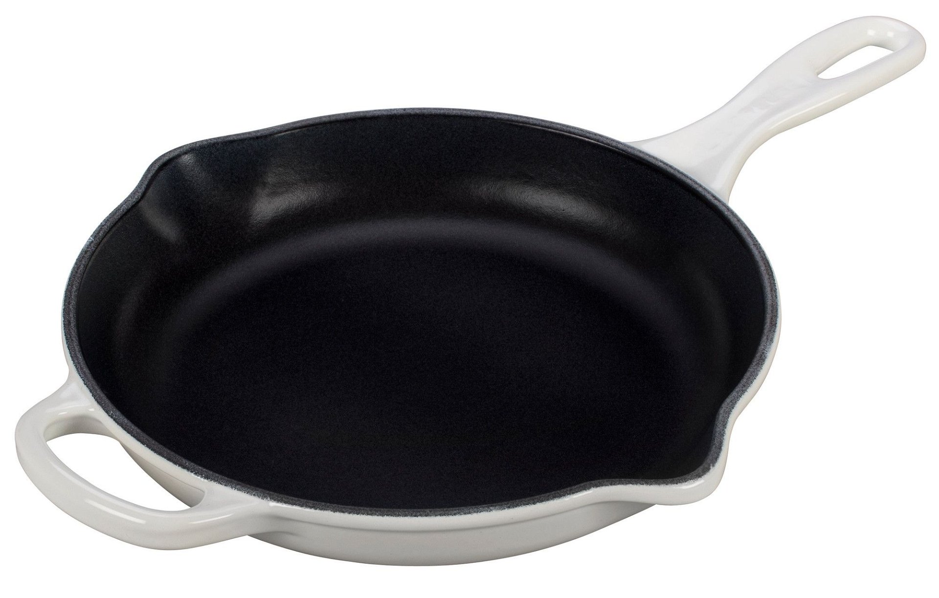 Baking, sautéing, and frying delicious food is easy and fun with the Signature Iron Handle 9” Skillet from Le Creuset. This enameled cast iron frying pan will become a staple in your daily life. It only gets better with age, too; over time a natural patina develops on the black enamel that is ideal for either searing or frying. This also means there is no need to season the cast iron. There is a large handle and a convenient helper handle on the opposite side to assist when carrying between the oven, stovetop, and table. The cast iron provides superior heat distribution and retention, assuring your food will cook evenly and efficiently. The elegant enamel coating in White on the outside of the skillet is long-lasting and resists chipping and cracking. This skillet works well with ceramic, electric, gas, halogen, induction, outdoor grill, and oven heating sources. It really can do it all! For high-quality cast iron skillets, go with Le Creuset!