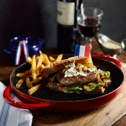 Share juicy, BBQ-grilled chicken tenders at family dinner with Staub’s Cherry Red 10 Inch Cast Iron Pure Grill Pan. This compact cast iron grill pan is made to cook your food slowly, and evenly so that every bite is just the way you want it. With this compact cast iron grill pan, you can enjoy all of the wonderful benefits of Staub cast iron cookware, without the same, bulky weight. Its interior black matte enamel coating is scratch-resistant and the handles on either side make it easy to use and maneuver. From stove to oven, this cast iron grill pan is compatible with all cook tops, including induction, and oven and broiler safe up to 500°F. With Staub’s 10” Cast Iron Pure Grill Pan, enjoy delicious home BBQ just the way you like it.