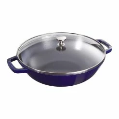 Search no further—the perfect pan is well within your reach! The Staub Perfect Frying Pan in Dark Blue is the quintessential frying pan for everyday use. This frying pan set includes a half-moon shaped stainless-steel rack. The wide angled shape lets you stir and toss your food without spilling. Great for making lobster bisque, beefy chili, braised chicken plus so much more. This remarkable frying pan is resistant to rust, chipping and cracking. The coating requires no additional seasoning like some other cast-iron pieces so you can get to cooking up a marvelous dinner for all of your family and watch those smiles on their face appear.