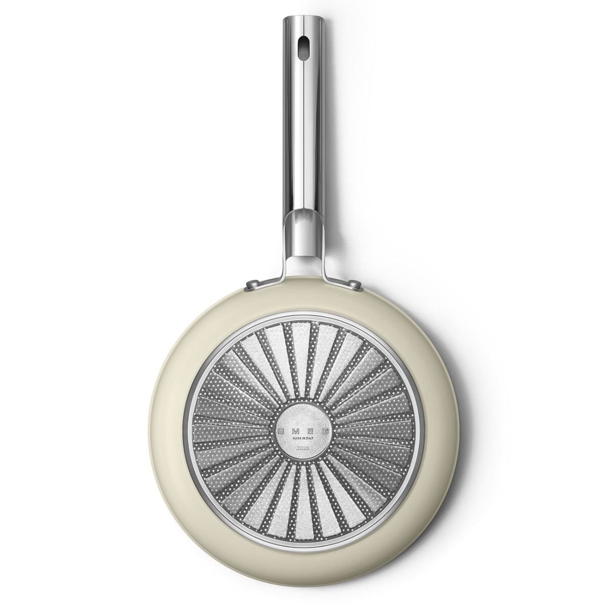 Fry all your breakfast meals and meats with the new SMEG 9.5” Frying Pan in Cream! Designed by Italian firm Deepdesign, this frying pan has a cold-forged aluminum base with a stainless steel handle and bottom plate, making for a sturdy nostalgic design that meets contemporary application for it to be the prominent kitchen pan. From making omelets to skillet meals and frying burgers to small steaks, cooking in its nonstick Teflon coating allows swift release to cooked foods, makes cleaning less of a chore, and reduces how much cooking oil you would typically use! This fry pan can be used on all types of stoves, including induction, and is also heat resistant up to 480°F, meaning it will handle serious heat emitting from the stove top and dishwasher use time and time again. With its capabilities and two-year warranty, you cannot ask for more ease and convenience when using the SMEG 9.5” Frying Pan in Cream!